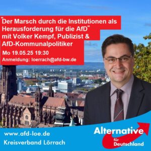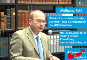 Wir laden Sie herzlich zu unserem Stammtisch zum Thema „Bericht aus der AfD-Kreistagsfraktion Lörrach“ ein. Referent ist unser AfD-Fraktionsvorsitzender im Kreistag Lörrach, Wolfgang Fuhl. Er war Landtagskandidat 2016 und Bundestagskandidat 2017 im Wahlkreis Lörrach. Wolfgang Fuhl war bis zu seiner Verrentung Betriebsratsvorsitzender eines großen Textilveredelers in Lörrach. Er ist zudem ehemaliger Vorsitzender des Oberrates der …