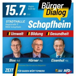 Sehr geehrte Damen und Herren, wir laden Sie herzlich zum Bürgerdialog der AfD-Landtagsfraktion BW ein. Redner: – Dr. Michael Blos, Betreuungsabgeordneter, MdB – Hans-Peter Hörner, MdL – Bernhard Eisenhut, Betreuungsabgeordneter, MdL Ort: Stadthalle Schopfheim, Hauptstraße 11, 79650 Schopfheim Zeit: Dienstag, 15. Juli 2025 19:00 Freunde und Bekannte dürfen gerne mitgebracht werden! Wir freuen uns auf Ihr …