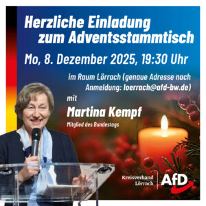 Wir laden Sie herzlich zu unserem Adventsstammtisch mit der AfD-Bundestagsabgeordneten Martina Kempf aus Breisach ein. Martina Kempf war Vorsitzende des Regionalverbandes Freiburg der Aktion Lebensrecht für Alle (ALfA) e. V. Sie trat 2013 in die AfD ein und ist Mitgründerin der Bundesvereinigung Christen in der AfD. Sie ist zudem Mitgründerin und stellvertretende Vorsitzende des Vereins „Vertriebene, Aussiedler …